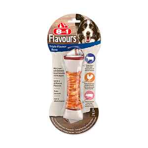 Pochoutka Triple Flavour kost žvýkací L od značky 8in1 vyrobená ze surové vepřové a hovězí kůže, obalená kuřecím masem. Pro dlouhotrvající zábavu vašeho psa.