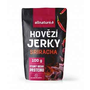 Allnature BEEF Sriracha Jerky je vysoce kvalitní sušené hovězí maso s příchutí chilli omáčky. Vysoký obsah proteinu zajistí regeneraci svalů a kondici po celý den.