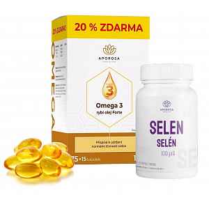 APOROSA Omega 3 rybí olej Forte 90 kapslí a Aporosa Selen 100 µg 60 kapslí Výhodné balení omegy 3 a prémiového doplňku stravy se selenem.