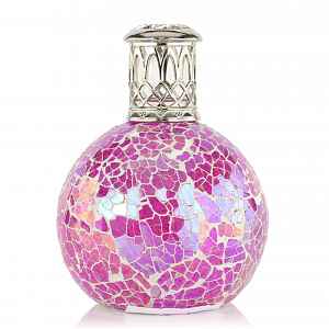 Ohromující růžové odstíny od jasně fuchsiové po světle růžovou tvoří třpytivou ručně vyráběnou mozaiku vonné lampy Fuchsia Fizz, završenou stříbrnou korunou.