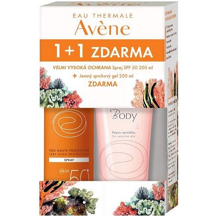 Sprej SPF 50+ poskytuje vysokou ochranou proti UVA a UVB záření. Je obohacený o termální vodu z Avène, která báječně hydratuje a zklidňuje pokožku. Sprej je hypoalergenní a vhodný i pro citlivou kůži. DÁREK: Body Sprchový gel s jemnou relaxační vůní šetrně čistí pokožku obličeje a celého těla. Přináší zklidnění díky vodě z Avène a olejovému komplexu. Použití: Sprej SPF 50+: Před pobytem na slunci aplikujte dostatečné množství spreje. Snížením množství přípravku snižujete stupeň ochrany. K udržení ochrany aplikaci často opakujte, zejména při pocení, po koupání nebo osušení ručníkem. Body Sprchový gel: Jemně vmasírujte do navlhčené pokožky a vytvořte pěnu. Poté opláchněte čistou vodou. Upozornění: Sprej SPF 50+: Zabraňte styku s očima. Při zasažení očí okamžitě důkladně vypláchněte vodou. Prostředky na ochranu proti slunečnímu záření neposkytují 100% ochranu před ultrafialovým zářením.