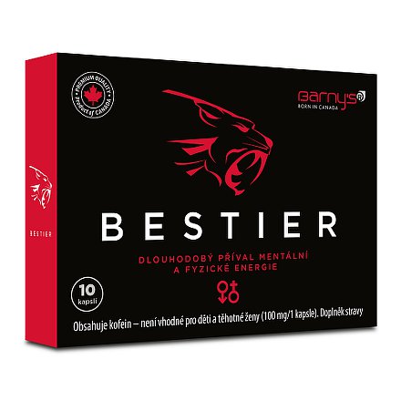 Pro dlouhodobý příval mentální a fyzické energie. Vhodný při celkové vyčerpanosti a únavě. Ženšen přispívá k normální činnosti krevního oběhu a k sexuálnímu zdraví. Příznivě působí na vitalitu a snížení únavy. Podporuje kognitivní a duševní výkonnost. Guarana tonizuje tělo a mysl. Napomáhá duševní výkonnosti, fyzické a psychické vitalitě. Withanie (indický ženšen) příznivě ovlivňuje energii, vitalitu, svaly a výdrž. Přispívá ke koncentraci a snížení únavy. Maca přispívá k pocitu fyzického a duševního zdraví, k vitalitě a vytrvalosti. Vitaminy B6 a B12 přispívají ke snížení míry únavy a vyčerpání. Bestier je vhodný: Při celkové vyčerpanosti a únavě. Pro ranní vstávání. Při únavě za volantem. Při nervovém vypětí např. při zkouškách. Dávkování: Dospělí užívají 1 kapsli denně.