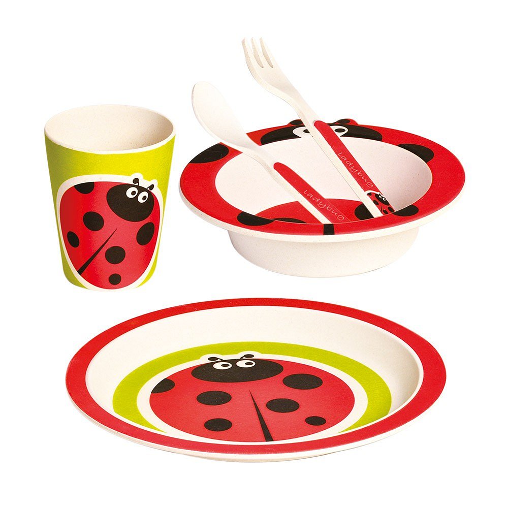Dětské nádobí z bambusu s motivem berušky. Sada 5 dílů se svěžím přírodním vzhledem je z ekologického a biologicky rozložitelného materiálu. Vhodné do myčky na nádobí. Nevhodné pro ohřívání v mikrovlnné troubě.