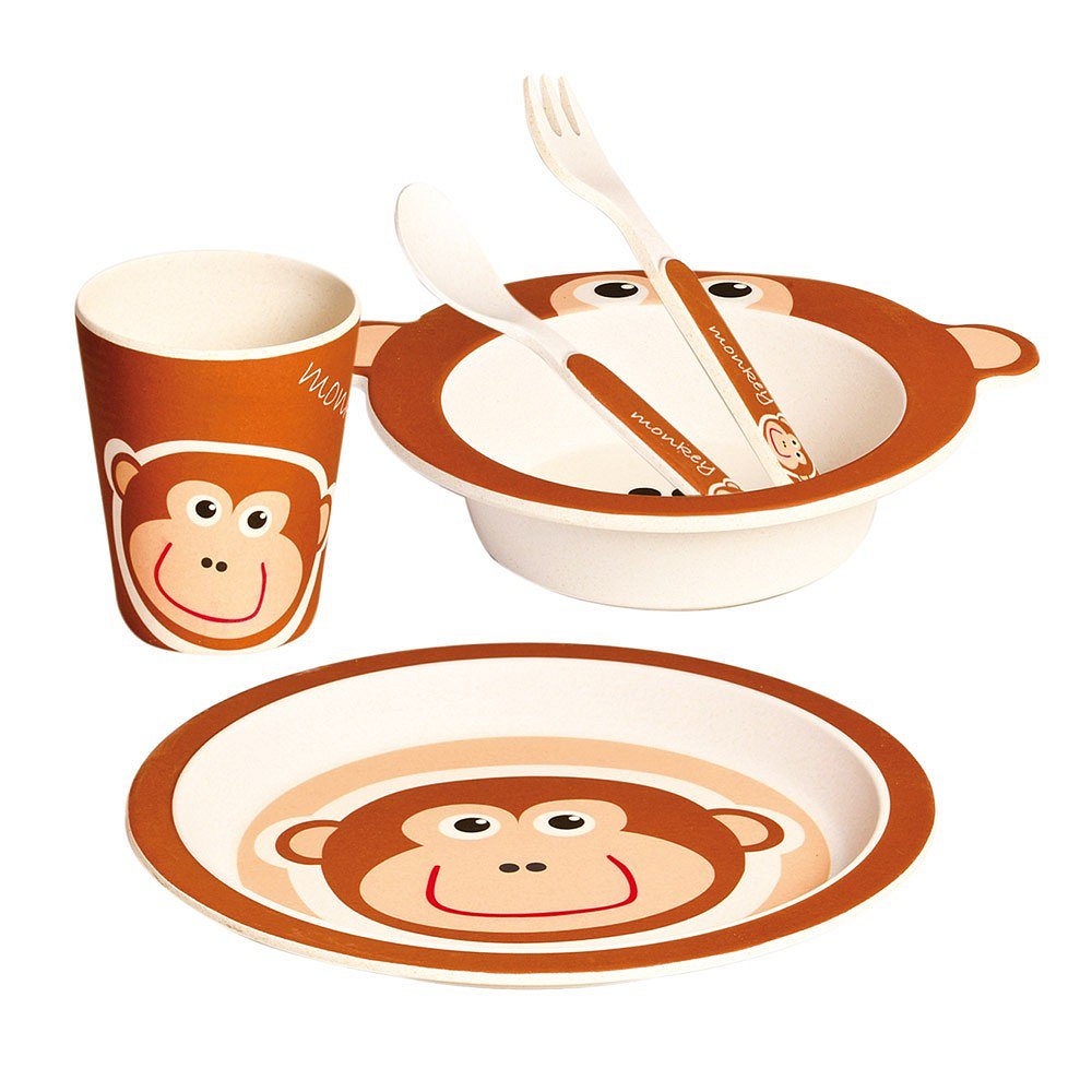 Dětské nádobí z bambusu s motivem opičky. Sada 5 dílů se svěžím přírodním vzhledem je z ekologického a biologicky rozložitelného materiálu. Vhodné do myčky na nádobí. Nevhodné pro ohřívání v mikrovlnné troubě.