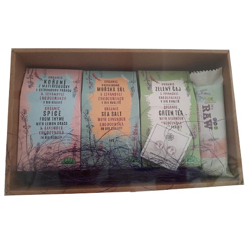 BIO Levandulové zdraví s Levandulovými náušnicemi. BIO zelený sypaný čaj s Levandulí Chodouňskou, BIO hrubozrnná mořská sůl s Levandulí Chodouňskou, BIO koření z mateřídoušky s Levandulí Chodouňskou, BIO Raw Jahodová tyčinka, Levandulové náušnice. Obdarujte své blízké zdravím z Levandulového údolí. Imunita z čisté přírody a klidné nervy jsou nejkrásnějším dárkem. Levandulové náušnice vytvořila mladá desigérka z Berounska. Ručně vyrobeno a baleno v Manufaktuře v Levandulovém údolí.