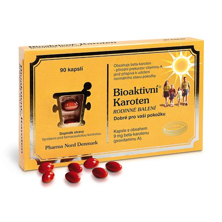 Bioaktivní Karoten je doplněk stravy ve formě kapslí, který obsahuje čistý beta-karoten odpovídající 1500 μg vitaminu A. Vyrábí se míšením beta-karotenu s olejovým základem, který udržuje účinnou látku stabilní a zvyšuje její biologickou dostupnost. Beta-karoten patří do skupiny žlutých a červených rostlinných složek s barevným efektem. Je tou látkou, která dodává oranžovou barvu například mrkvi. Je to rovněž provitamin, který se přeměňuje na vitamin A v množství, které tělo potřebuje. Vitamin A Napomáhá normálnímu buněčnému dělení. Je nezbytný pro normální funkci imunitního systému. Přispívá k udržení normálního stavu pokožky a zraku. Dávkování: Dospělí a děti od 12 let užívají 1-2 kapsle za den, děti od 3 let užívají 1 kapsli ob den. Kapsle užívejte celé, po jídle. Složení: Sójový olej, želatina, hydrogenovaný sójový olej (částečně hydrogenovaný), glycerol (E 422), beta-karoten, oxid křemičitý (E 551). Upozornění: Nepřekračujte doporučenou denní dávku.