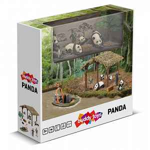 Roztomilá rodinka pandy velké s ošetřovateli a s přístřeškem v lese.