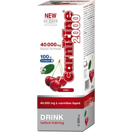 Carnitine 2000 višeň - tekutý doplněk stravy s L-Carnitinem; 40 000 mg 100 % karnitinu (Carnipure) v 500 ml. Použití: jako doplněk při dietách k redukci hmotnosti a před zátěží ve sportu.
