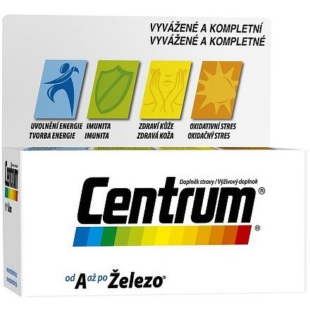 Centrum AZ je doplněk stravy, který obsahuje vyvážené množství vitamínů, minerálů a navíc esenciální mikroprvky pro podporu výživy a životního stylu dospělých až do 50 let věku. Přípravek je kompletní od A až po Železo, vhodný ke každodennímu užívání. Mohou ho užívat i osoby citlivé na lepek a diabetici. přizpůsobená množství vitaminů B (B1, B2, B6, B12), manganu a hořčíku, které přispívají k normálnímu energetickému metabolismu přizpůsobená množství vitaminů A, C a D, mědi, selenu a zinku, které přispívají k normální funkci imunitního systému, a tedy podporují Váš imunitní systém pro zdraví Vaší kůže -Centrum® od A až po Železo obsahuje kombinaci vitaminu A, zinku, niacinu a biotinu, která přispívá k udržení normálního stavu Vaší pokožky, a také vitamin C, který přispívá k normální tvorbě kolagenu pro normální funkci kůže ochrana před oxidativním stresem - přizpůsobená množství antioxidantů (např.