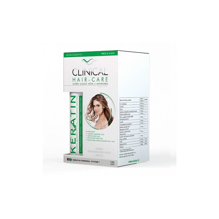 Balení pro péči o vlasy od Clinical obsahuje doplněk stravy Clinical hair-care a keratin. Jedná se o 4 měsíční kúru. CLINICAL hair-care Je doplněk stravy obsahující KERATIN RENEWAL SYSTEM, který dodává živiny vlasovým buňkám. KERATIN RENEWAL SYSTEM je doplněn o Nutrikomplex, tvořený širokým spektrem nejdůležitějších vitamínů a minerálů. Pro lepší dostupnost aktivních látek až k cílovým buňkám obsahuje přípravek unikátní Pycnograph-IN activator, obsahující pycnogenol s extraktem ze semen hroznů. Clinical Keratin hloubková regenerační kúra Pro obnovu a regeneraci suchých, poškozených a chemicky narušených vlasů. Bez parabenů, sulfátů, lepku, silikonů, ropy, umělých barviv a minerálních olejů. Omezuje třepení, lámavost a krepatění vlasů. Vyhlazuje povrch vlasů a posiluje vnitřní stavbu vlasů. Hydratuje. Přispívá k zdravému růstu vlasů a dodává vlasům lesk a předchází elektrizování. Aktivní látky: 30 % přírodního keratinu, Arganový olej, Ceraminy, Ricinový olej. Balení obsahuje 120 tobolek doplňku stravy Clinical Hair-care a Keratin regenerační kúru 100 ml.