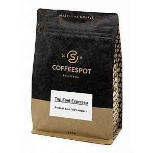 Coffeespot Top Spot Espresso je jemná směs čtyř prvotřídních arabik s čokoládovými a kakaovými tóny, nízkou kyselostí a středně intenzivním pražením.