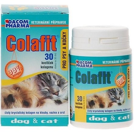 Colafit Dog a Cat je přípravek pro domácí mazlíčky, kteří mají problémy s klouby. Přípravek neobsahuje žádné chemické látky, barviva či konzervanty. Je úplně bez chuti a zápachu a po navlhčení se dá kostička snadno spolknout.
