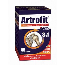 Přípravek obsahující 3 složky: Glukosamin 600 mg , Chondroitin 500 mg a čistý kolagen. - glukosamin (z mořských ulit) - chondroitin (ze žraločí chrupavky) - čistý krystalický kolagen. Složení 2 tobolky: 600 mg glukosamin hydrochloridu z ulit mořských korýšů, 500 mg chondroitin sulfátu ze žraločí chrupavky a 6 mg lyofilizovaného kolagenu. Způsob užití: Artrofit se užívá 2x denně 1 tobolka. Doporučená doba užívání: 3 měsíce, opakuje se 2x ročně. Upozornění: Přípravek není vhodný pro děti do 3 let, o užití přípravku během těhotenství a kojení se poraďte se svým ošetřujícím lékařem. Není určeno jako náhrada pestré stravy. Nepřekačujte doporučenou denní dávku. Uchovávejte mimo dosah dětí! Zdroj: www.dacom.cz
