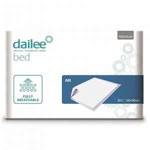 Dailee BED Premium AIR 60x60 Plně prodyšné jednorázové absorpční podložky pro inkontinentní pacienty spolehlivě a účinně chrání lůžko, využívají se také jako podpora během přebalování. Používají se především pro inkontinentní pacienty, kteří mají popáleniny nebo proleženiny.