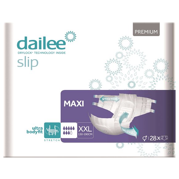 Dailee SLIP Premium Maxi XXL Jednorázové pleny pro dospělé jsou určeny k zachycování moči a stolice. Převážně jsou určeny při řešení potíží s inkontinencí. Mají anatomický tvar pro dokonalou přiléhavost a maximální pohodlí. Poskytují dlouhodobý pocit sucha.