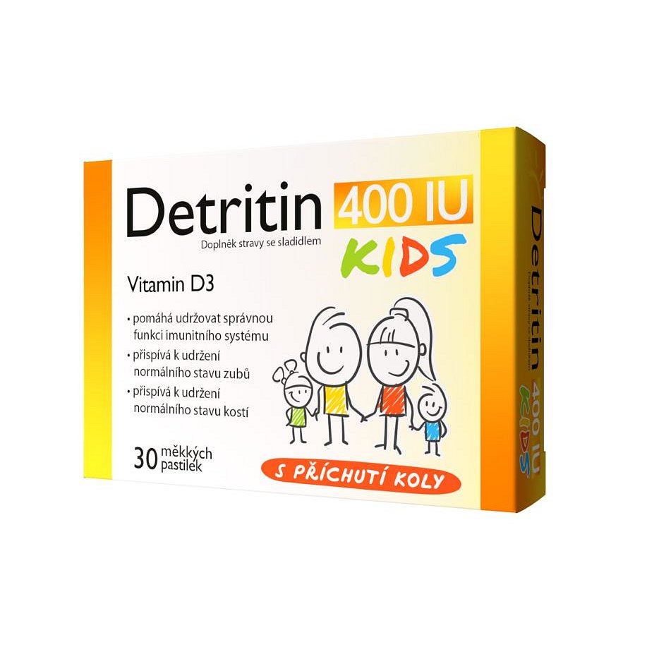 Detritin Kids 400 IU vitamin D3 obsahuje vitamin D3 ve formě pastilek s příchutí koly. Vitamin D je důležitý pro zdravou imunitu Vašich dětí a pevné kosti a zuby.