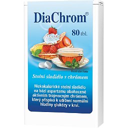 DiaChrom je moderní nízkokalorické stolní sladidlo na bázi aspartamu obohacené o speciální biochemicky vysoce aktivní komplex označovaný jako glukózotoleranční faktor. Jeho aktivní složkou je trojmocný chróm, který přispívá k udržení normální hladiny glukózy v krvi a k normálnímu metabolismu makroživin. Velkou předností tohoto sladidla je chuť velmi podobná cukru bez nepříjemných pachutí typických pro běžná stolná sladidla. DiaChrom je vhodný pro diabetiky, všechny druhy redukčních diet a pro osoby, které chtějí sladit zdravě. Dodáván v balení 80 tablet a 600 tablet.