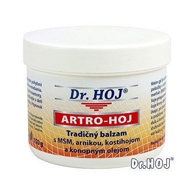 Popis ARTRO-HOJ Tradiční balzám s MSM, arnikou, kostivalem a konopným olejem je určen k vyživování, regeneraci a prokrvení pokožky v oblasti kloubů a kloubního okolí. Popis ARTRO-HOJ Tradiční balzám s MSM, arnikou, kostivalem a konopným olejem: Methylsulfonylmethan (MSM) je přírodní zdroj biologicky aktivní síry, která přispívá k normální funkci krevního oběhu a cév a blokuje přenos impulzů bolesti v buňkách (např. při zmrzlém rameni, ztuhlých kloubech, zádech a podobně), vitamíny C, E, arnika, angelika, kostival, levandule a konopný olej vyživují, zlepšují elasticitu a zjemňují ztuhlé tkáně, kafr a methylsalicylát pomáhají přehřívat kůži a přispívají k pocitu úlevy a relaxace. Složení Aqua, Paraffi num liquidum, Dimethyl sulfone, Polyacrylamide C13-14 isoparafin at Laureth-7, Propylene glycol, Methyl salicylate, Cannabis sativa seed oil, Phenoxyethanol, Ethylhexylglycerin, Symphytum offi cinale leaf extract, Angelica polymorpha sinensis root extract, Arnica montana extract, Camphor, Lavandula angustifolia oil, Tocopheryl acetate, Ascorbic acid Balení 150 g Upozornění Určeno pouze k zevnímu použití.