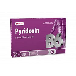 Vitamin B6 (pyridoxin) přispívá: K normální činnosti nervového a imunitního systému. Ke snížení míry únavy a vyčerpání. K regulaci hormonální aktivity. K normálnímu homocysteinu. K normální tvorbě červených krvinek. Složení: 20mg vitamínu B6 v 1 tabletě. Plnidla (mikrokrystalická celulóza, maltodextrin), protispékavé látky (stearan hořečnatý, oxid křemičitý), pyridoxin hydrochlorid, potahové látky (hydroxypropylmethylcelulóza, oxid titaničitý, polydextróza, mastek, středně řetězcové triglyceridy, polyethylenglykol). Dávkování: 1 tableta denně. Upozornění: Nepřekračujte doporučenou denní dávku. Není určeno jako náhrada pestré stravy. Ukládejte mimo dosah dětí. Nevhodné pro děti, těhotné a kojící ženy.
