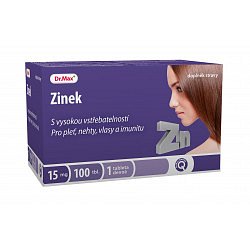 Zinek s vysokou vstřebatelností. Zinek je důležitý pro udržení normálního stavu kostí, nehtů, pokožky a vlasů. Napomáhá normální funkci imunitního systému a chrání buňky před oxidativním stresem. Pozitivně ovlivňuje syntézu bílkovin a metabolismus sacharidů. Dávkování: Užívejte 1 tabletu denně. Složení: Stabilizátor (uhličitan vápenatý), citrát zinečnatý, plnidlo (mikrokrystalická celulóza, kukuřičný škrob), protispékavá látka (zesíťovaná sodná sůl karboxymethylcelulózy, hořečnaté soli mastných kyselin), pojivo (maltodextrin), protispékavá látka (oxid křemičitý), leštící látka (hypromelóza), filmotvorná látka (polyvinylalkohol), stabilizátor (sodná sůl karboxymethylcelulózy), protispékavá látka (mastek). Upozornění: Nepřekračujte doporučenou denní dávku. Není určeno jako náhrada pestré stravy. Ukládejte mimo dosah dětí. Není určeno pro děti do 3 let.