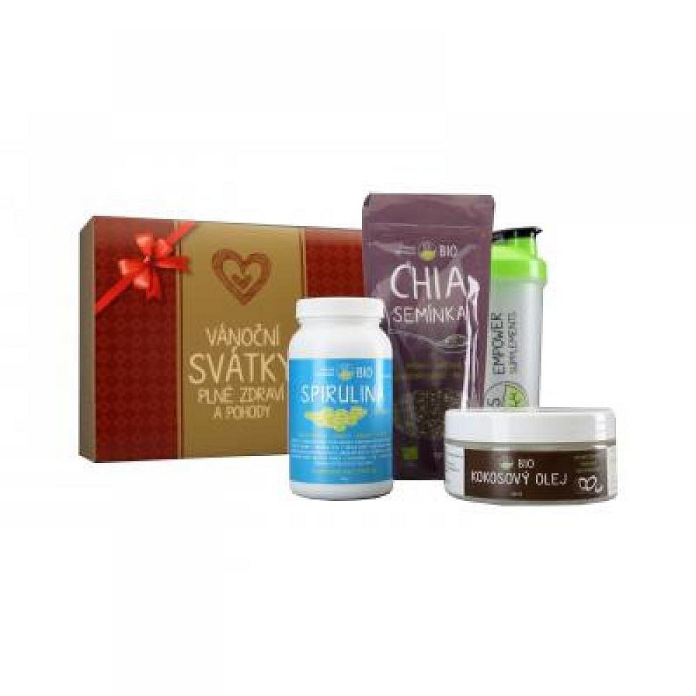 Krásný dárek plný zdraví pro vaše blízké. Balíček obsahuje Spirulinu, Chia semínka a kokosový olej a navíc Shaker.