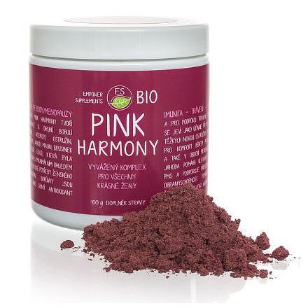 ES BIO Pink Harmony obsahuje 12 druhů bobulí (ostružiny, hroznové víno, borůvky, semínka granátového jablka, plody acai, acerola, kustovnice - goji, klikva, maliny, plody maqui, černý rybíz a třešeň). Borůvky jsou zde jako silný antioxidant a pro podporu trávení. Optimalizují hladinu cukru v krvi a ulevují od pocitu těžkých nohou. Hroznové víno uleví od pocitu těžkých nohou. Maliny ulevují při PMS a také v období menopauzy. Černý rybíz pomůže při odvodnění organizmu a osvěží znavené tělo. Kontroluje tělesnou hmotnost a napomáhá efektivnímu hubnutí. Acerola je malá červená bobulka připomínající třešeň. Acerola obsahuje až 30x více vitamínu C než pomeranč. Třešně a višně jsou vyhledávaným ovocem mj. pro obsah jódu, hořčíku, zinku, vápníku, železa, křemíku, fosforu a vitamínů C, E, B. Užívání: ES BIO Pink Harmony můžete rozmíchat ve 150 ml chladné neperlivé vodě a vypít. Pro dospělé osoby je vhodná jedna vrchovatá čajová lžička dvakrát denně na lačno. Není vhodné pro děti do tří let.