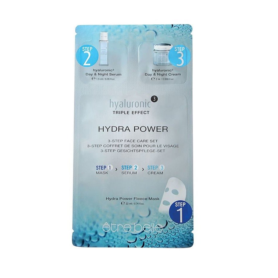être belle Hyaluronic Hydra Power 3-step set maska s kyselinou hyaluronovou obsahuje fleecovou masku a sérum a krém pro denní i noční využití.