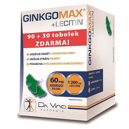 Doplněk stravy s lecitinem a extraktem Ginkgo biloba. Složení: 1 tobolka obsahuje: standardizovaný extrakt Ginkgo biloba (24% flavonoidních glykosidů a 6% terpenických laktonů) 60,0 mg, lecitin 1200,0 mg. Dále: leštící látky: včelí vosk, emulgátory: sojový olej, želatina, zahušťovadla: glycerin, barviva: přírodní barvivo karamel, čištěná voda. Ginkgo biloba, neboli jinan dvoulaločný, je strom pocházející z Asie. Poznáte ho zejména podle typických dvoulaločných listů, které jsou zmíněny i v jeho českém pojmenování. Listy jinanu dvoulaločného obsahují látky - terpenlaktony a flavonoglykosidy. Lecitin je látka, jež se získává převážně ze sojového oleje. Doporučená denní dávka: 1 tobolka, nejlépe po jídle. Upozornění: Výrobek není určen pro děti do 3 let. Může snižovat srážlivost krve. Nepřekračujte doporučenou denní dávku. Není vhodné pro těhotné a kojící ženy. Obsahuje sóju. Není určené jako náhrada pestré stravy.