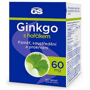 GS Ginkgo 60 Premium je doplněk stravy obsahující silný extrakt ginkga z mladých lístků obohacený o hloh, gotu kolu a hořčík.Ginkgo biloba podporuje duševní rovnováhu, kognitivní funkce a mikrocirkulaci krve.Hloh obecný podporuje normální činnost srdce a transport kyslíku v těle.Gotu kola pomáhá udržovat dobrý stav kardiovaskulárního systému a normální činnost cév.Hořčík přispívá ke snížení míry únavy a vyčerpání, k normální činnosti nervové soustavy a k normální psychické činnosti.Výhody:Extrakt z mladých lístků ginkga.Obohaceno o gotu kola, hloh a hořčík.Výrobek je bez cukru, bez lepku i bez laktózy.Balení obsahuje 90 tablet.