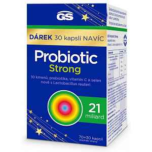 GS Probiotic Strong je doplněk stravy ve formě kapslí. Super kombinace 10 extrémně odolných živých probiotických kultur s L.reuteri a L. rhamnosus GG. Navíc je obohacen o vitamin C, selen a prebiotika. Vhodné ke každodennímu užívání.Benefity:Přípravek obsahuje 21 miliard probiotických mikroorganismů, 10 kmenů laktobacilů a bifidobakterií. Tyto kmeny odolávají prostředí žaludku a dostanou se do tenkého střeva. Dále obsahuje prebiotika, která jsou důležitá pro výživu probiotik.Selen, který přispívá k normální funkci imunitního systému.Balení obsahuje 70 + 30 kapslí (celkem 100 ks). Hmotnost obsahu 20,8 g.