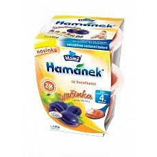 Hamánek Svačinka se švestkami 100% ovoce je ovocný příkrm od dokončeného 4. měsíce. Sterilováno. Zpracované ovoce. Ovocné protlaky - směsi, neslazené. Bez přidaného cukru. Obsahuje přirozeně se vyskytující cukry.