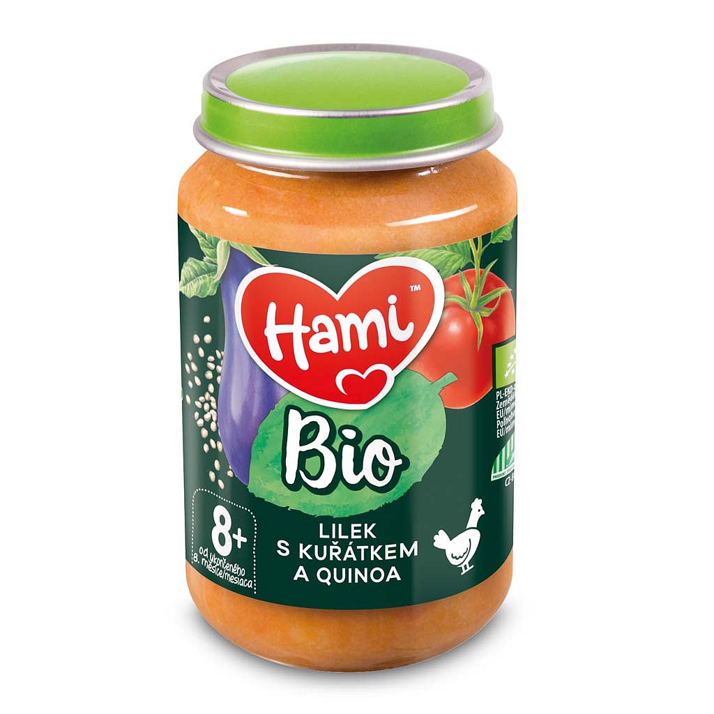 Zeleninu má již Váš drobeček ve svém jídelníčku zavedenou a už jste jistě vyzkoušeli i masíčko. Maso je cenným zdrojem bílkovin, vitamínu B12 a železa. Vyberte si skleničku s telecím, kuřecím, hovězím nebo krůtou. Kvalitní a pestrá strava je pro nás důležitá, proto v Hami BIO příkrmech najdete výběr zajímavých zelenin jako květák, pastiňák, dýně, lilek a jiné. Maso do našich příkrmů pečlivě vybíráme a pochází jen z prověřených BIO farem. HAMI BIO masozeleninový příkrm Lilek s kuřátkem a quinoa neobsahuje přidanou sůl, neobsahuje lepek a mléčnou složku a je 100 % bez konzervantů (dle zákona). Navíc všechny suroviny pochází z ekologického zemědělství. Víme, že výživa dítěte v prvních 1000 dnech života hraje klíčovou roli pro jeho zdraví v dospělosti, a proto s Hami můžete mít jistotu, že Vaše děťátko dostává vhodnou výživu. A v čem je HAMI BIO masozeleninový příkrm Lilek s kuřátkem a quinoa tak výjimečný? BIO kvalita pestrost a kvalita v každé lžičce zelenina vařená v páře maso z ověřených BIO farem bez lepku bez přidané soli kojenecká kvalita 100 % bez konzervantů dle zákona Důležitá upozornění: HAMI BIO masozeleninový příkrm Lilek s kuřátkem a quinoa 190 g je potravina pro zvláštní výživu určená pro kojence a malé děti od uk. 8. měsíce věku. Složení: rajčatové pyré z koncentrátu* 23,3 %, pastinák*22 %, voda, lilek* 15 %, kuřecí maso – stehno* 8,5 %, quinoa* 7,5 %, rýžová mouka*, cibule*, slunečnicový olej s vysokým obsahem kyseliny olejové*, oregano*, česnek*. *z ekologického zemědělství (zemědělská produkce EU/mimo EU)