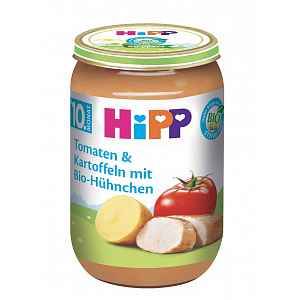 Od 10. měsíce můžete přejít z jemně rozmixovaných jídel na příkrmy s malými kousky potravy, vaše děťátko se tak naučí žvýkat a usnadníte mu tak přechod na pevnou stravu. V prvních 3 letech života záleží na kvalitě každé lžičky. My v HiPPu to víme, a proto máme přísné BIO zásady: Zásadně nepoužíváme pesticidy a chemicky syntetizovaná hnojiva. Zeleninu necháváme zrát tak dlouho, jak potřebuje, aby byla chutná a výživná. Zpracováváme ji šetrně, aby si uchovala důležité živiny a vitamíny. Zodpovědně pečujeme také o naše zvířata, protože jen spokojená a zdravá zvířata dávají kvalitní maso. Obsahuje drobné kousky, aby se děti naučily kousat. Bez přídavku soli – obsah soli je daný obsahem sodíku. Bez lepku Omega-3 mastné kyseliny z řepkového oleje – pro vývoj mozku a nervových buněk. Bez přídavku aromat, barviv, konzervačních látek a modifikovaného škrobu – dle zákona. Bez geneticky modifikovaných surovin dle Nařízení pro Ekologické zemědělství. **Složení:* voda, brambory* 26 %, rajčata* 25 %, kuřecí maso* 9,4 %, kukuřičná mouka*, rýžový škrob*, cibule*, řepkový olej* 1,9 %, koření*. Pozn.: Bez lepku *z ekologického zemědělství Výživové údaje 100 g: Energetická hodnota: 335 kJ/80 kcal Tuky: 3,2 g z toho nasycené mastné kyseliny: 0,6 g Sacharidy: 9,6 g z toho cukry: 0,9 g Bílkoviny: 2,7 g Sůl: <0,05 g Sodík: <0,02 g Kyselina alfa-linolenová (omega-3 mastné kyseliny): 0,13 g Příprava Otevřenou skleničku nebo porci ohřejte ve vodní lázni nebo v mikrovlnce, obsah zamíchejte plastovou lžičkou, abyste nepoškodili skleničku a ověřte teplotu. Neohřáté množství skladujte v uzavřené skleničce v chladničce a spotřebujte do 24 hodin. Pro zdraví dítěte dodržujte návod k přípravě a skladování. Skladujte v suchu při pokojové teplotě. Země původu: Maďarsko Adresa dodavatele: HiPP Czech,Pekařská 628/14, Praha 155 00, Česká republika