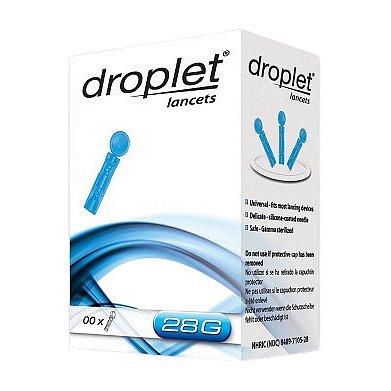 Lanceta Droplet 28G 100ks Lanceta, zdravotnický prostředek, je ostrý chirurgický nástroj, obvykle ve tvaru oboustranně broušeného kopí. Tvar ostří umožňuje méně bolestivé proříznutí kůže, než k odběrovým účelům používané jehly.