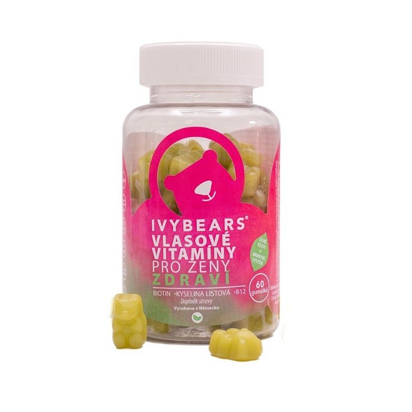Přípravek IvyBears vlasové vitamíny pro ženy Zdraví ve formě chutných gumových medvědů ochucených koncentrátem šťávy ze sladké brambory a jablek. Pro zdravý růst vlasů a nehtů.