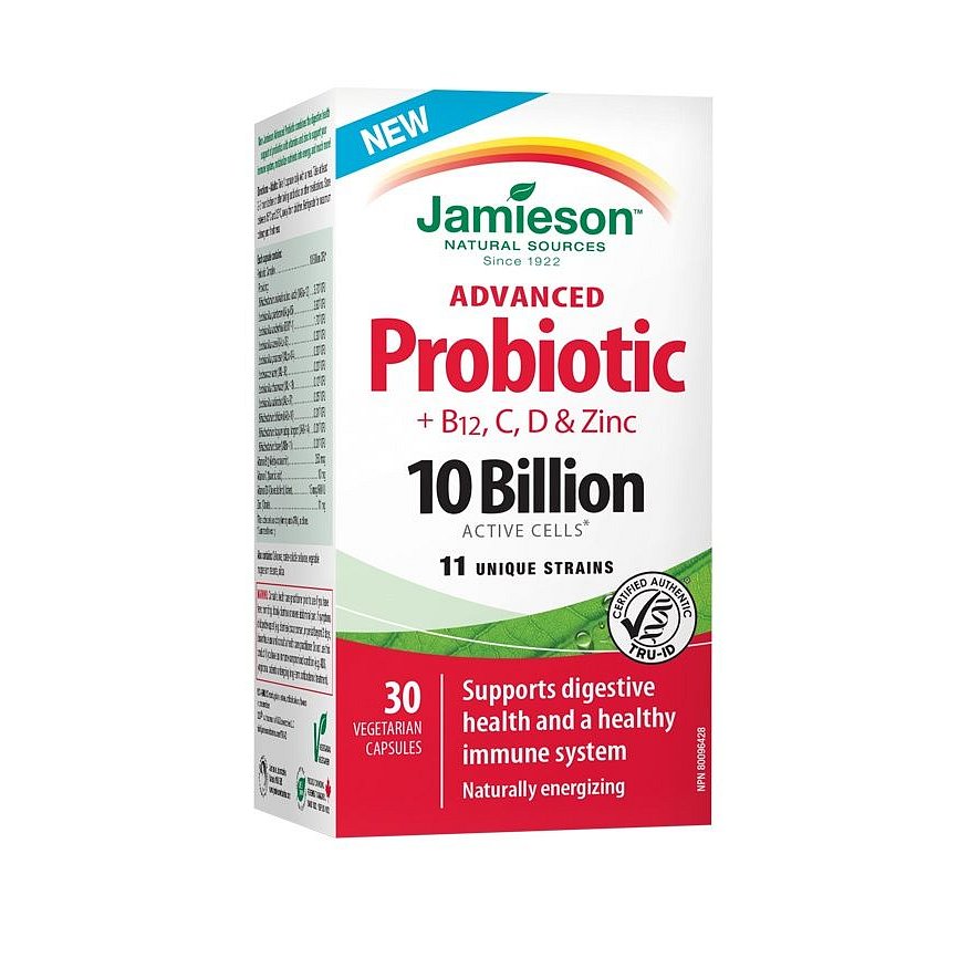 Jamieson ADVANCED Probiotic 10 miliard + vitamíny B12, C, D a zinek 11 kmenů probiotických kultur ve snadno polykatelných vegetariánských kapslích.