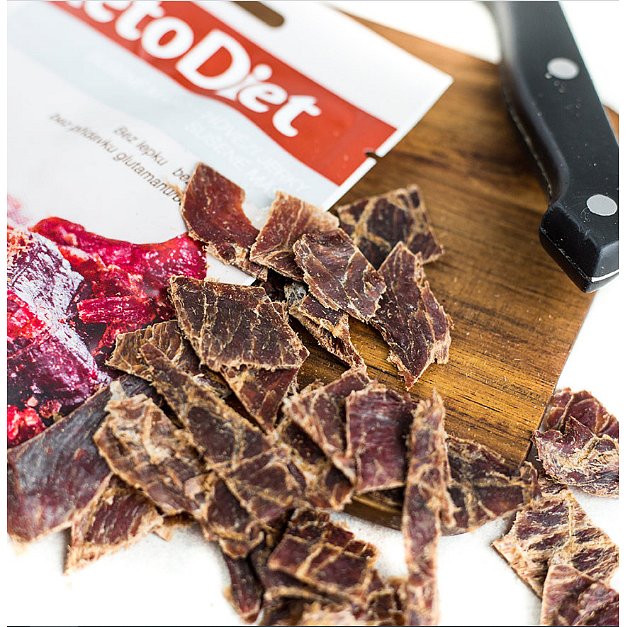 Sušené maso hovězí jerky (3 porce) Vynikající chuť opravdového masa, voňavá, křupavá a bílkovinami nabitá pochoutka. Voňavé jerky jsou vyrobené z nejkvalitnějších surovin získaných z vybraných malochovů v České republice. Ochutnejte velmi jemně nasolené 4 mm silné plátky prvotřídního hovězího masa, pozvolna sušeného po obou stranách několik hodin. Sušené maso je skvělou variantou běžného bílkovinového jídla. Jako zdravá svačinka poslouží i těm, kteří právě nehubnou.