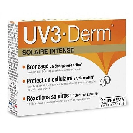 UV3•DERM je exkluzivní kombinace ingrediencí pro přípravu pokožky na toleranci vůči slunci. Připravuje, aktivuje a prodlužuje opalování, chrání pokožku před volnými radikály zodpovědné za změnu buněčné struktury způsobující stárnutí.