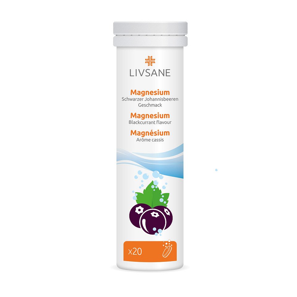 LIVSANE Šumivé tablety Magnézium černý rybíz je doplněk stravy, který obsahuje hořčík. Tablety mají příchuť černého rybízu a obsahují sladidla. Hořčík přispívá k normální činnosti svalů, normální psychické činnosti, normální činnosti nervové soustavy, udržení normálního stavu kostí, udržení normálního stavu zubů a ke snížení míry únavy a vyčerpání. Balení obsahuje 20 šumivých tablet