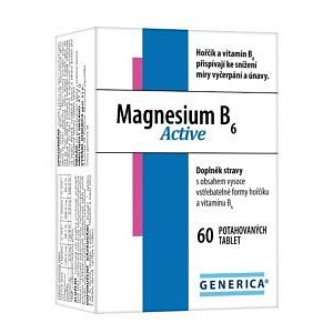 Generica Magnesium B6 Active je doplněk stravy s obsahem vysoce vstřebatelné formy hořčíku a vitamínu B6. Hořčík se v tomto přípravku nachází v organické, vysoce vstřebatelné formě s vysokou biologickou dostupností. Přidaný vitamín B6 zlepšuje absorpci hořčíku. Horčík a vitamín B6 přispívají: ke správnému fungování nervového systému, ke správné funkci psychiky, ke správné látkové výměně důležité pro tvorbu energie, ke snížení vyčerpání a únavy. Hořčík napomáhá ke správnému fungování svalů a k udržení zdravých kostí a zubů. Přípravek neobsahuje lepek, laktózu ani cukr. Balení obsahuje 60 tablet.