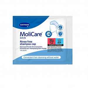 Čepice na mytí vlasů bez oplachu od MoliCare Skin obsahuje šampon i kondicionér. Zajišťuje pohodlné mytí vlasů i pokožky hlavy bez oplachování. Ideální k použití na lůžku.