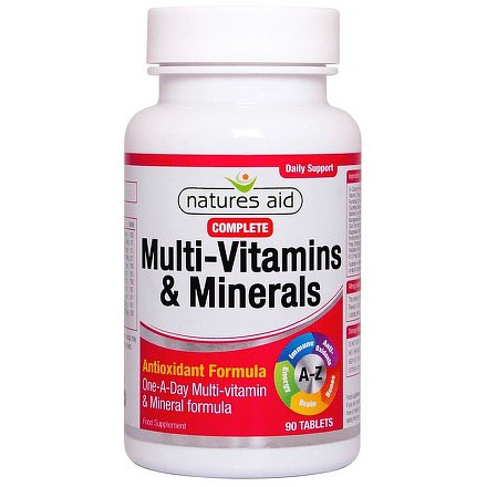 Multivitamíny a minerály Complete od britské společnosti Natures Aid. Obsahují vyvážené množství vitamínů, minerálů a aktivních látek v denní dávce 1 tablety.