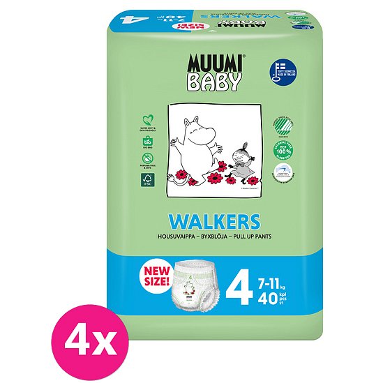 Nová velikost plenkových kalhotek s unikátním systémem proti úniku tekutiny, na trh dodává finská rodinná společnost se 40letou tradicí. Muumi Walkers – „pro malého gymnastu“. Super elastický model pro aktivní batolata. Super elastické Mnohonásobná elasticita v oblasti pasu zaručuje výborně padnoucí střih pro různé proporce miminek. Dvojitá ochrana před únikem Speciální struktura pro ochranu před únikem u nohou pro zajištění dokonalého bezpečí. Vítěz v testu Courtray2010. Dobrý střih Ideální pro aktivní batolata, která si ráda hrají a milují pohyb. Jednoduché nošení Zapínací mechanismus umožňuje jednoduché zapnutí i odepnutí Plenkové kalhotky S ECO známkou Nordic SWAN. Certifikované, bez alergenů užívaných ve výrobě a při zpracování surovin. Vlastnosti: vhodné pro atopickou pokožku vhodné pro denní i noční použití vlákna celulózy z certifikovaného lesa TCF = 100% zcela bez chloru nejlepší představitel v oblasti externích laboratorních testů, pokud jde o absorpci oproti úniku Složení: 100% bio finská celuloza, netkaná fólie