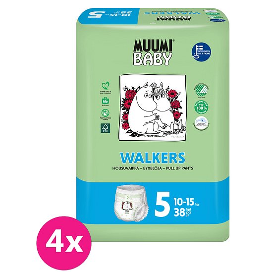 Nová velikost plenkových kalhotek s unikátním systémem proti úniku tekutiny, na trh dodává finská rodinná společnost se 40letou tradicí. Muumi Walkers – „pro malého gymnastu“. Super elastický model pro aktivní batolata. Super elastické Mnohonásobná elasticita v oblasti pasu zaručuje výborně padnoucí střih pro různé proporce miminek. Dvojitá ochrana před únikem Speciální struktura pro ochranu před únikem u nohou pro zajištění dokonalého bezpečí. Vítěz v testu Courtray2010. Dobrý střih Ideální pro aktivní batolata, která si ráda hrají a milují pohyb. Jednoduché nošení Zapínací mechanismus umožňuje jednoduché zapnutí i odepnutí Plenkové kalhotky S ECO známkou Nordic SWAN. Certifikované, bez alergenů užívaných ve výrobě a při zpracování surovin. Vlastnosti: vhodné pro atopickou pokožku vhodné pro denní i noční použití vlákna celulózy z certifikovaného lesa TCF = 100% zcela bez chloru nejlepší představitel v oblasti externích laboratorních testů, pokud jde o absorpci oproti úniku Složení: 100% bio finská celuloza, netkaná fólie