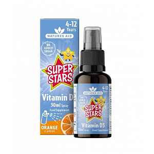 Natures Aid Vitamin D3 ve spreji pro děti od 4-12 let příchuť pomeranč obsahuje denní dávku vitaminu D pro podporu imunity i zdravý růst a vývin kostí u dětí.