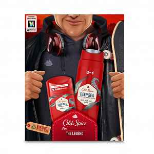 Old Spice Deep Sea dárková sada v kartonové krabičce s designem skejťáka obsahuje tuhý deodorant a pánský sprchový gel Deep Sea s osvěžující vůní.