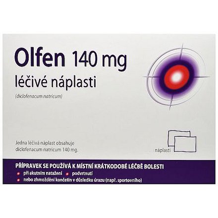 Olfen 140 mg léčivé náplasti je přípravek, který působí proti bolesti. Patří do skupiny přípravků nazývaných nesteroidní protizánětlivé léky (NSAID). Určeno pro dospělé a dospívající od 16 let. Čtěte pozorně příbalový leták.
