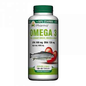 Bio-Pharma Omega 3 1000 mg EPA 180 mg a DHA 1200 mg je doplněk stravy ve formě tobolek. Silná dávka kvalitního koncentrovaného oleje z mořských ryb žijících v chladných mořích, který obsahuje vysokou dávku nenasycených mastných kyselin - kyseliny eikosapentaenové EPA 180 mg a kyseliny dokosahexaenové DHA 120 mg. EPA a DHA přispívají k normální činnosti srdce. Balení obsahuje 160 tobolek.