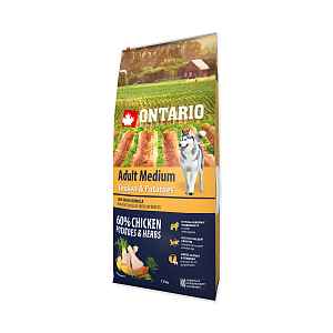 Kompletní, superprémiové krmivo s kuřecím masem, bramborami a bylinkami Ontario Adult Medium je určené pro dospělé psy středních plemen.
