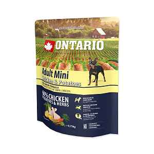 Kompletní, superprémiové krmivo s kuřecím masem, bramborami a bylinkami Ontario Adult Mini je určené pro dospělé psy malých plemen.